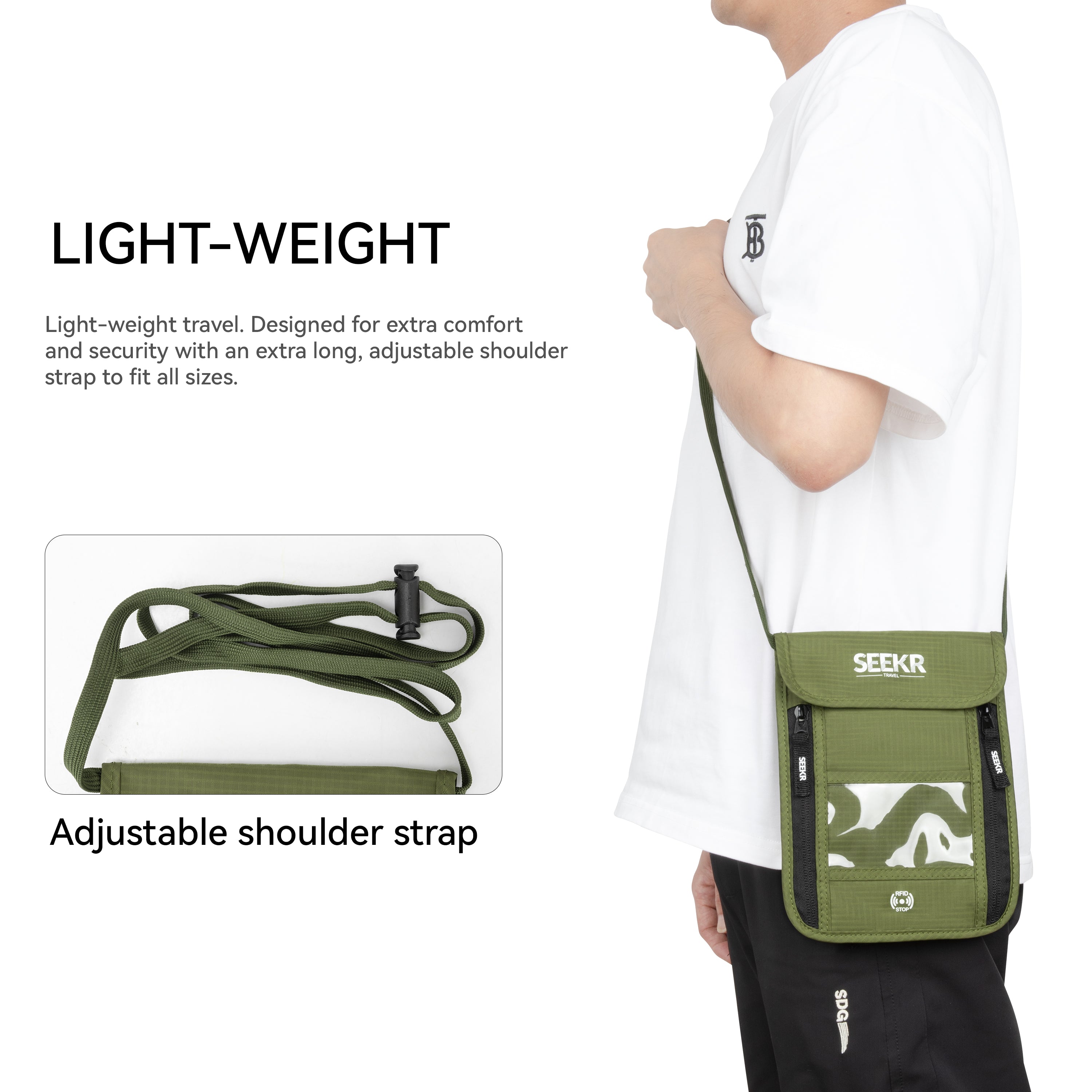 Worried about weather conditions? Our passport holder is water-resistant, protecting your documents and valuables from unexpected spills or rain. Our multiple pockets design allows for efficient organization – easily store your passport, credit cards, boarding passes, phone and cash in dedicated compartments. Equipped with strong zippers and an adjustable neck strap that we have custom lengthened to fit any size, our unisex travel wallet will keep your items secure.